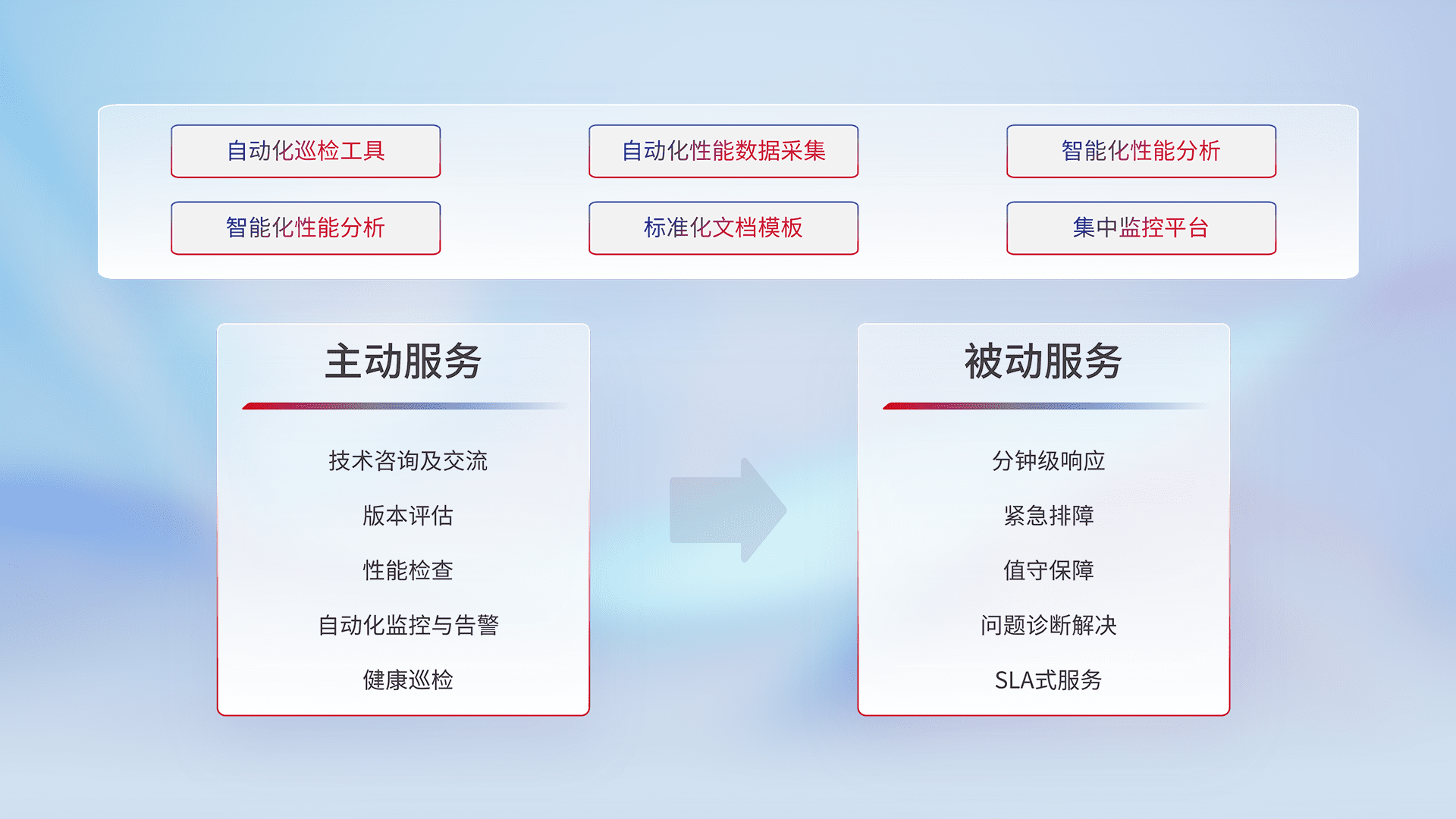 智能化工具和标准化文档,,,,保障服务质量,,提供主动服务(包含技术咨询、、、、版本评估、、性能检查、、、、自动化监控与告警、、、健康巡检)和被动服务包含(分钟级响应、、、紧急排障、、值守保障、、问题诊断解决、、、SLA服务)。。。。